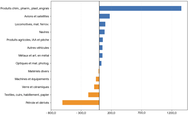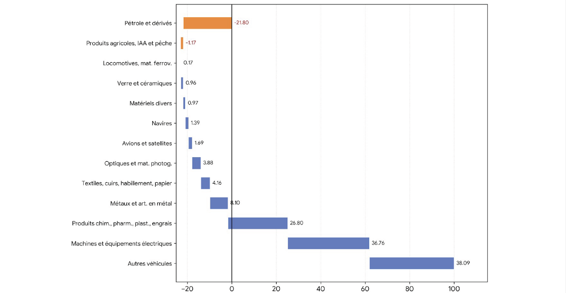 Lecture : Entre les moyennes 2008-10 et 2022-24, la variation de la contribution du solde des produits pétroliers au solde global atteint –613 %.