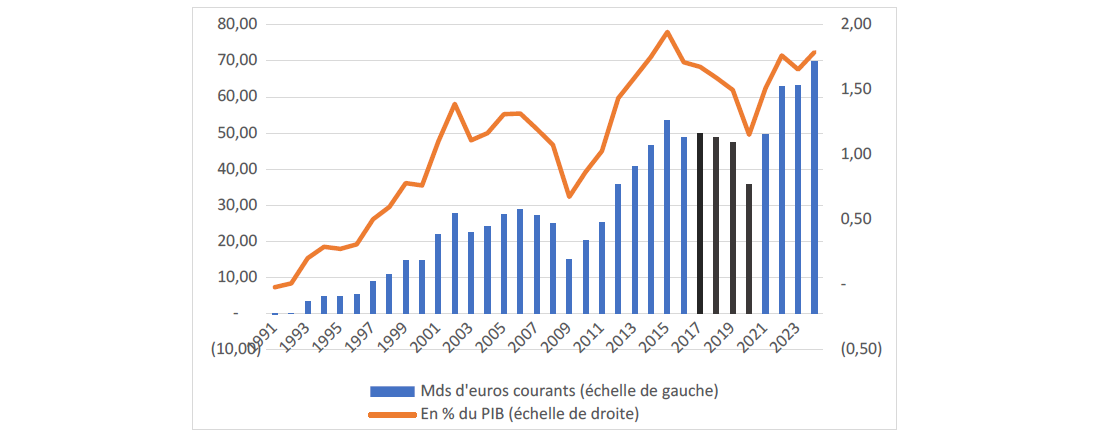Depuis le début des années 2000, la part de l’Allemagne dans les exportations mondiales de marchandises s’est rapprochée de celle des États-Unis qui avoisine 8 %, essentiellement parce que celle des États-Unis a baissé. Du reste, depuis 2015, ils sont devenus son premier partenaire commercial, dont elle tire un excédent remarquable. En 2024 ses exportations vers les États-Unis représentaient 10,4 % de ses exportations (1ère position), et 6,9 % de ses importation (2ème position). La même année, 3,7 % de l’ensemble des exportations des États-Unis étaient destinés à l’Allemagne (7ème position), alors que 4,9 % de l’ensemble de ses importations en provenaient (4ème position). Dans les deux cas, le décalage entre exportations et importations illustre l’importance du surplus du commerce extérieur allemand. Sa valeur a d’ailleurs nettement augmenté depuis le premier mandat du président Trump, pour atteindre les 70 milliards d’euros courants en 2024 (graphique 1). Ce chiffre est en grande partie dû à l’excédent de marchandises.