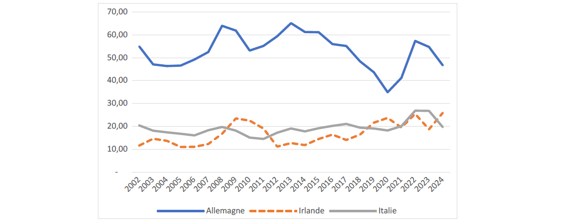 Trois catégories de produits (machines, véhicules, médicaments) représentent à eux seuls 60 % des exportations des marchandises de l’Allemagne vers les États-Unis, qui absorbent en outre 20 % de ses exportations de médicaments. Le graphique 2 souligne également qu’à elle seule l’Allemagne représente régulièrement plus de 50 % de l’excédent du solde des marchandises de l’UE. On comprend qu’elle aurait pu être l’un des pays européens les plus touchés par la guerre commerciale lancée par Trump II.