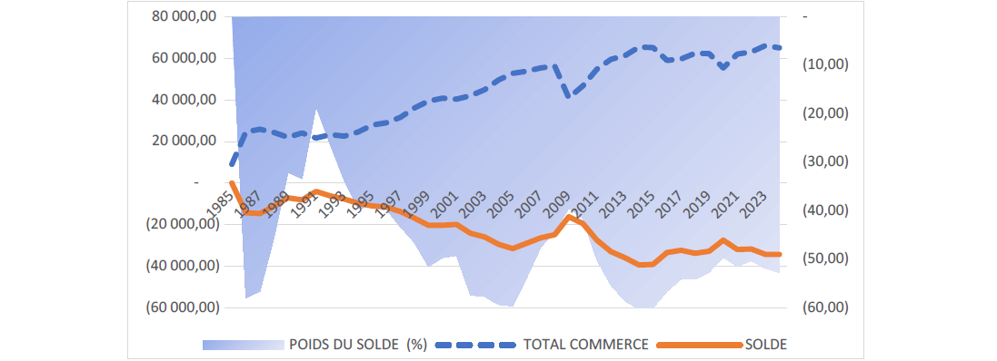 Lecture : en 2024 le déficit des marchandises atteint –50 % du commerce bilatéral.