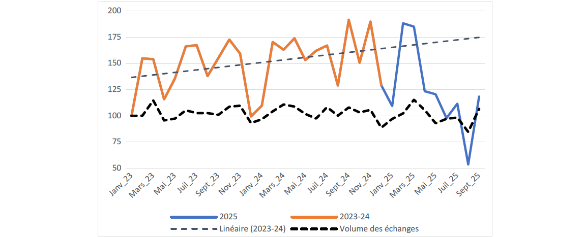Il n’en reste pas moins que les incertitudes et la guérilla commerciale lancée par Trump II ont conduit à une détérioration du solde commercial allemand pour les neuf premiers mois de l’année 2025, en rupture avec la progression des deux années précédentes. Le solde de septembre 2025 se situe à environ 70 % de la tendance des dernières années (Graphique 9). Toutefois pour l’instant le volume global des échanges a été moins affecté (Graphique 9). Sur ces neuf premiers mois de l’année les mesures en vigueur n’ont eu qu’un effet modeste sur les importations allemandes en provenance des États-Unis, qui n’ont que légèrement augmenté (+3 % par rapport à la moyenne des trois dernières années).